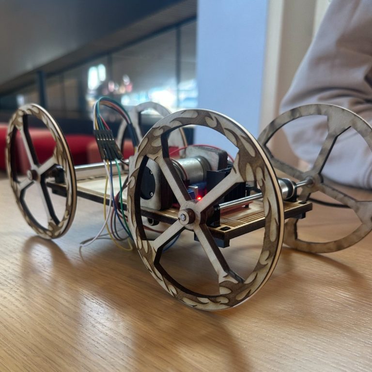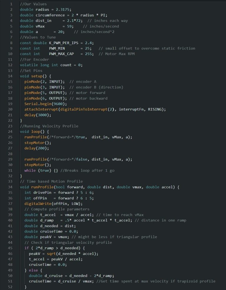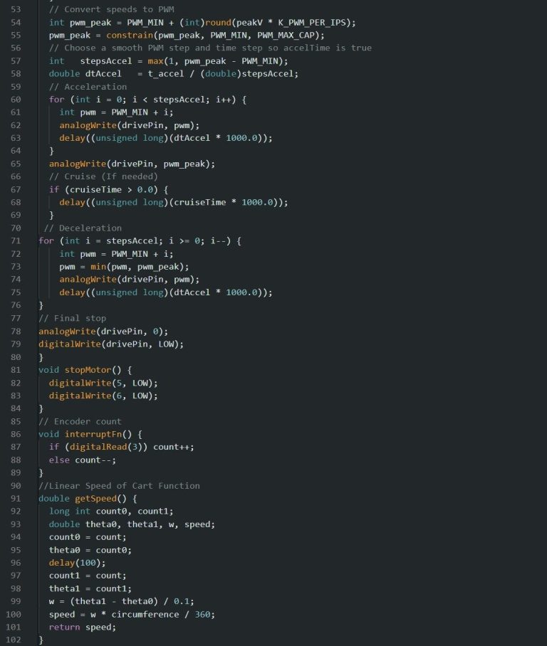 Our cart was great at holding up the bar and going at a relatively fast pace, the problem we ran into was our distance the cart traveled. The reason this was a problem was because a distance multiplier was needed because the motion code was time-based, but the motor required time to ramp from a very low starting speed (PMW_MIN = 25 RPM) before the cart actually began moving, shortening the effective velocity profile. Increasing PMW_MIN to fix this caused instability because the motor would instantly switch from +55 RPM to −55 RPM when reversing, creating a jerk that tipped the bar and also prevented a distance-based profile from working since the encoder could not register motion at lower speeds.