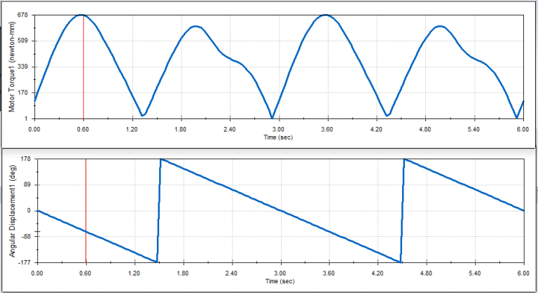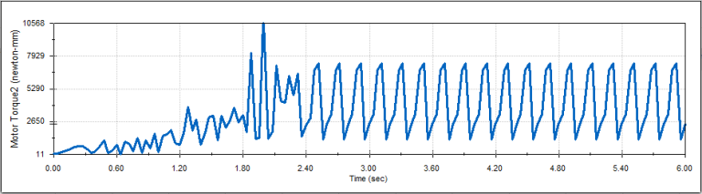 Later the Mechanism was tested at 600 RPMs and the value of 10,568.38 Nmm was found to be the maximum motor torque which means you would need a motor that could produce at least 10,568.38 Nmm to drive the crank at 600 RPMs.