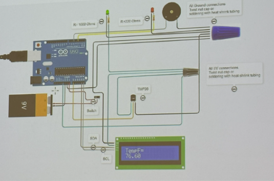 - Built a temperature-sensing alert box that functioned reliably, activating a green LED between 70–75°F and triggering audible and visual alarms outside that range.